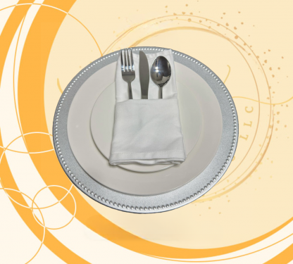 Set includes: Charger plate, Dinner plate, Salad plate, Napkin and Silverware set.